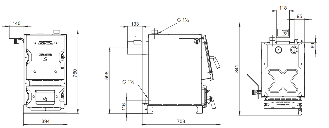 Габаритные размеры и монтажные подключения стального котла отопления Зота Мастер Х 14 кВт: