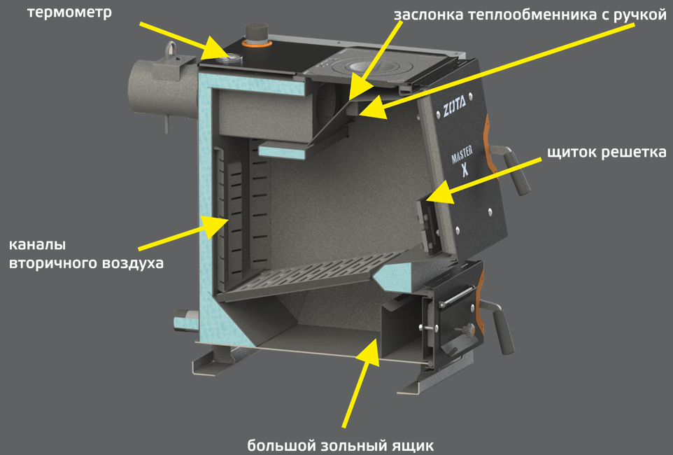 Использование стального котла Zota Master X 18 экономически выгодно благодаря трем основным особенностям его конструкции: